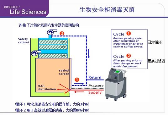 Bioquell的消毒設備和服務可以為用戶選擇提供多種解決方案, 事實上Bioquell過氧化氫蒸汽發(fā)生器就像一臺既可以自動也可以手動操作的**單反相機,當您熟練掌握使用方法以后,可以自行開發(fā)更多不同的應用,為您的投資創(chuàng)造更大的價值對于三級生物安全柜可以將蒸汽通過安裝好的傳送艙口,通過小型供風高效過濾器噴射進艙內(nèi),由排氣管連接返回的蒸汽形成閉合回路,將供氣和排氣過濾器一并消毒。