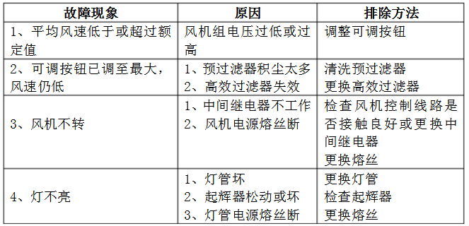 1.2、凈化工作區(qū)內(nèi)不宜存放不必要的物品,以保持潔凈氣流流型不受干擾。 1.3、定期(一般每二月一次)用熱球式電風速計測量工作區(qū)平均風速。若發(fā)現(xiàn)不符合技術(shù)指標,可以調(diào)節(jié)風機組電機的使用電壓,使工作臺處于**佳工況。